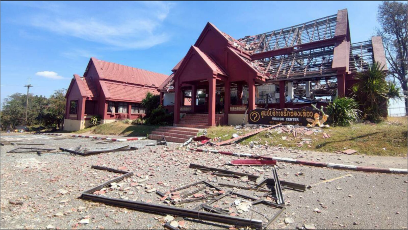 บริเวณที่ทำการอุทยานฯ กระสุน BM 20-40 ลูก 1.1 อาคารที่ทำการ กระจกแตกรอบอาคาร ฝ้าพังบางจุด หลอดไฟหลุดจากผนัง บ้านพักเจ้าหน้าที่ ภาพรวมเสียหายจำนวนมาก ผนัง หลังคา ฝ้า โรงจอดรถ อาคารค่ายเยาวชน เอื้องไอยเรศ กระสุน BM อาคาร โครงสร้างเสียหายหนัก ผนังฝ้าพัง บ้านพักเจ้าหน้าที่ ขนาด 3 ครอบครัว พังเสียหาย ผนังถูกสะเก็ดระเบิด ผนังฝ้าชำรุด เสาไฟฟ้าภายใน สายระบบน้ำรั่ว หลายจุด