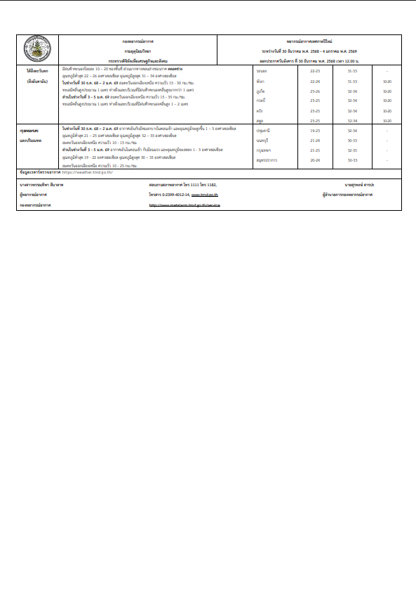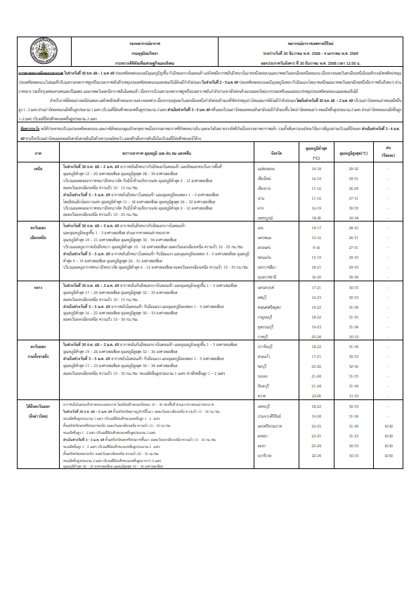 วันที่ 30 ธ.ค.2568 กรมอุตุนิยมวิทยา พยากรณ์อากาศในช่วงวันที่ 30 ธ.ค. 68 – 1 ม.ค. 69 ประเทศไทยตอนบนจะมีอุณหภูมิสูงขึ้น กับมีหมอกบางในตอนเช้า แต่ยังคงมีอากาศเย็นถึงหนาวในภาคเหนือตอนบนและภาคตะวันออกเฉียงเหนือตอนบน เนื่องจากลมตะวันตกเฉียงเหนือในระดับบนยังคงพัดปกคลุมประเทศไทยตอนบน ในขณะที่บริเวณความกดอากาศสูงหรือมวลอากาศเย็นที่ปกคลุมประเทศไทยตอนบนและทะเลจีนใต้จะมีกำลังอ่อนลง