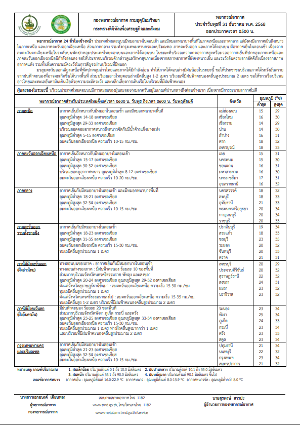 วันที่ 31 ธ.ค.2568 กรมอุตุนิยมวิทยา พยากรณ์อากาศ 24 ชั่วโมงข้างหน้า ประเทศไทยตอนบนมีหมอกบางในตอนเช้า และมีหมอกหนาบางพื้นที่ในภาคเหนือและภาคกลาง แต่ยังคงมีอากาศเย็นถึงหนาวในภาคเหนือ และภาคตะวันออกเฉียงเหนือ ส่วนภาคกลาง รวมทั้งกรุงเทพมหานครและปริมณฑล ภาคตะวันออก และภาคใต้ตอนบน มีอากาศเย็นในตอนเช้า
