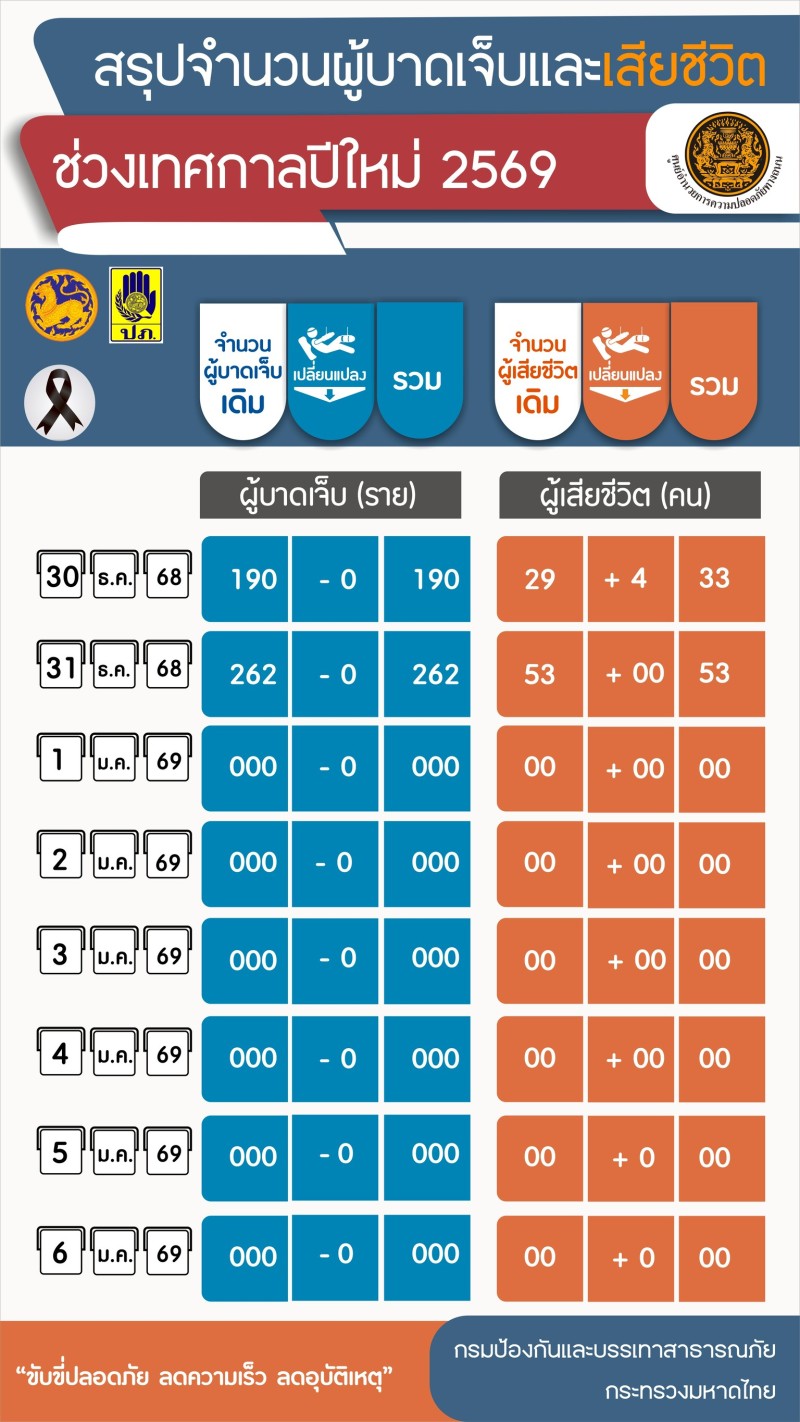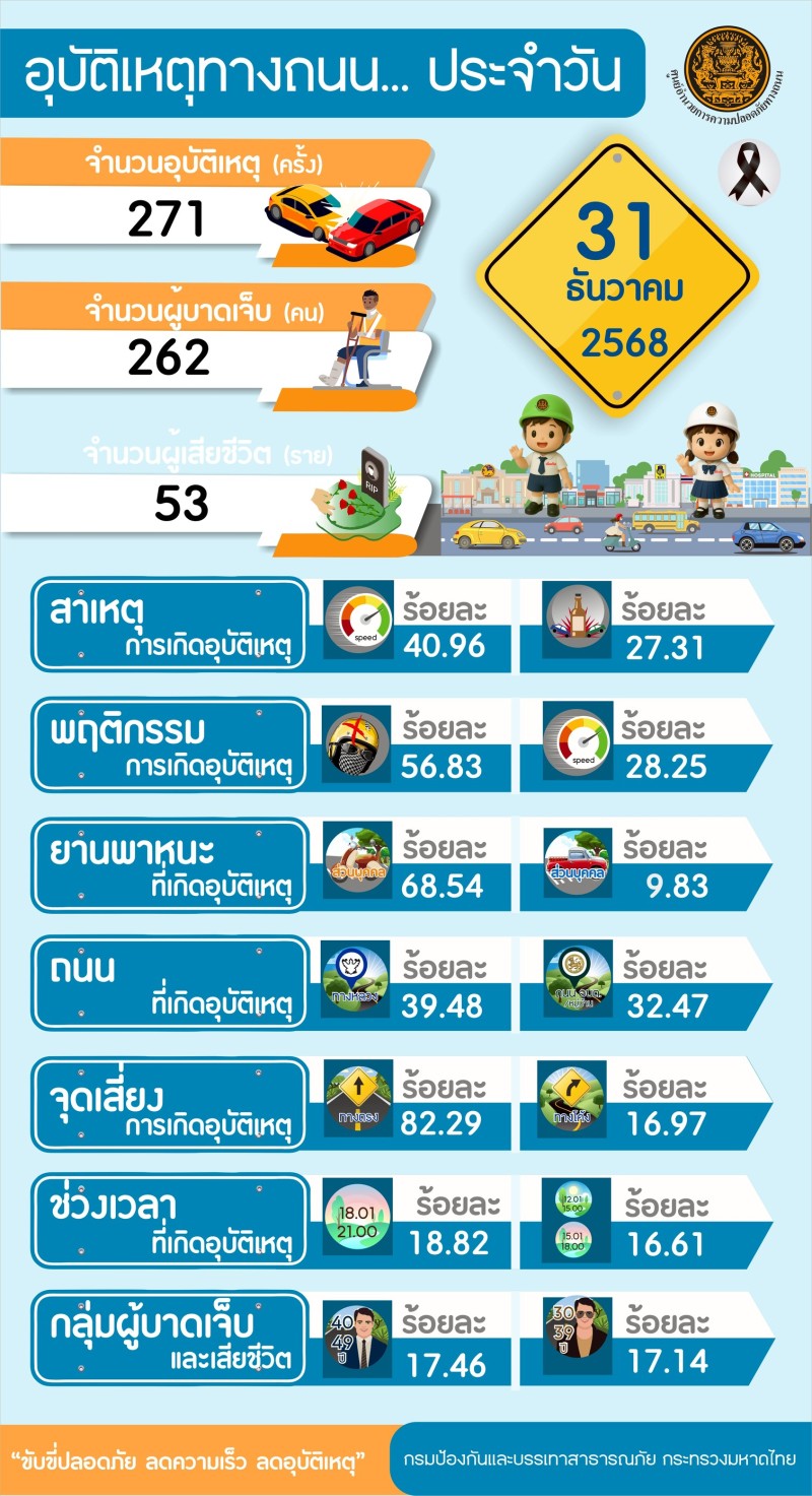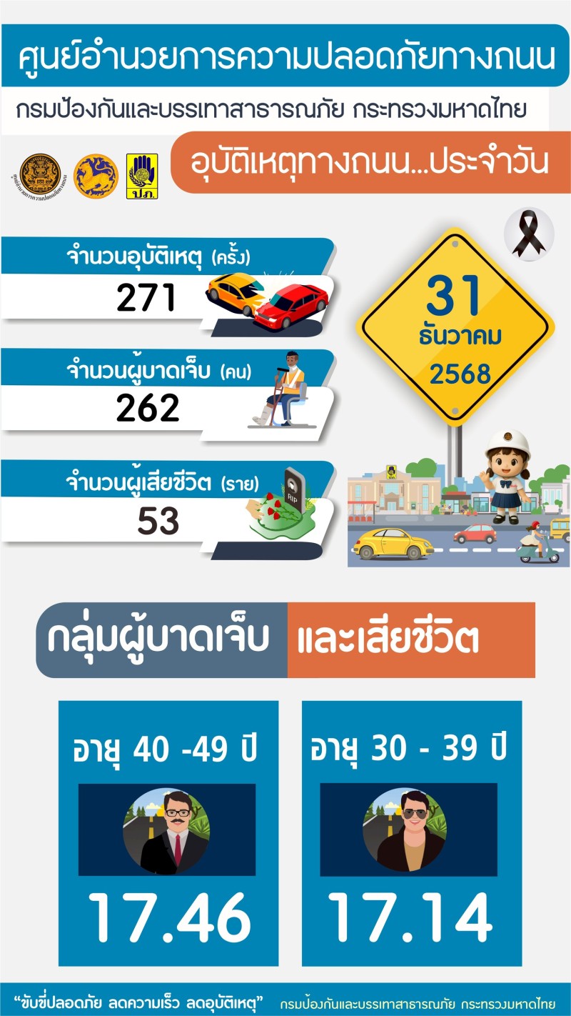 วันนี้ (1 ม.ค. 69) เวลา 10.15 น. ที่กรมป้องกันและบรรเทาสาธารณภัย (ปภ.) ศูนย์อำนวยการความปลอดภัยทางถนน (ศปถ.) แถลงสรุปสถิติอุบัติเหตุทางถนนช่วงเทศกาลปีใหม่ 2569 ประจำวันที่ 31 ธันวาคม 2568 เกิดอุบัติเหตุ 271 ครั้ง ผู้บาดเจ็บ 262 คน ผู้เสียชีวิต 53 ราย สรุปอุบัติเหตุทางถนนสะสมในช่วง 2 วัน ของการรณรงค์ (30 - 31 ธ.ค. 68) เกิดอุบัติเหตุรวม 469 ครั้ง ผู้บาดเจ็บ รวม 452 คน ผู้เสียชีวิต รวม 86 ราย จังหวัดที่ไม่มีผู้เสียชีวิต (ตายเป็นศูนย์) มี 36 จังหวัด ซึ่ง ศปถ. ได้กำชับดูแลกวดขันขับรถเร็ว - ดื่มแล้วขับ เน้นย้ำการบังคับใช้กฎหมายอย่างเข้มงวดและดูแลความปลอดภัยของประชาชนในพื้นที่อย่างต่อเนื่อง โดยเฉพาะการเดินทางท่องเที่ยวและทำบุญวันขึ้นปีใหม่ตามสถานที่ต่าง ๆ