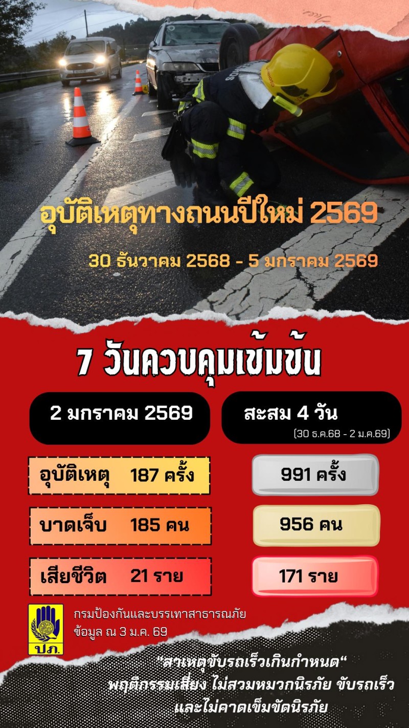 วันที่ 3 มกราคม 2569 เพจเฟซบุ๊ก กรมป้องกันและบรรเทาสาธารณภัย DDPM รายงานว่า ศปถ. รายงานสถิติอุบัติเหตุทางถนนช่วงเทศกาลปีใหม่ 2569 ประจำวันที่ 2 ม.ค. 2569 หลังประชาชนเริ่มทยอยเดินทางกลับ พบว่า มีอุบัติเหตุเกิดขึ้น 187 ครั้ง บาดเจ็บ 185 คน และเสียชีวิต 21 ราย