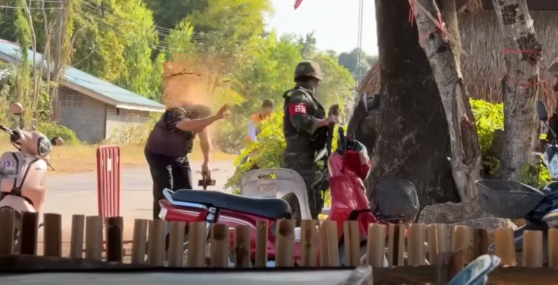 และอธิบายเพิ่มเติมในคอมเมนต์ว่า เล่าให้ฟัง วันธงชาติไทยจะมีคนๆ นึงชื่อป้าพร ที่ขอทหารเข้าไปปักธงชาติในบ้านโจกเจย (หนองจาน) แล้วมีการนำไปเสนอข่าวว่าแกเป็นแกนนำจะบุกเข้าไป เป็นมาเฟียปล่อยเงินกู้ ล่าสุดกล่าวหาว่าแกไปพูดว่าบ้านที่เสียหายจาก BM-21 หลังหนึ่งในบ้านหนองหญ้าแก้วได้รับเงินเยียวยา 5,700 บาท ซึ่งแกปฏิเสธมาตลอดไม่เป็นความจริง จึงฝังใจกับนักข่าวบางสำนักที่ไปเขียนข่าวใส่ร้ายแก วันนี้แกเจอหนึ่งในเป้าหมายที่แกหมายหัว จึงเข้าไปไล่ และเอาน้ำปลาร้าสาดไล่ คนในคลิปปรี่ไปหาแก แกเลยเอาฝาหม้อตีหัวไปอีกทีตามคลิป