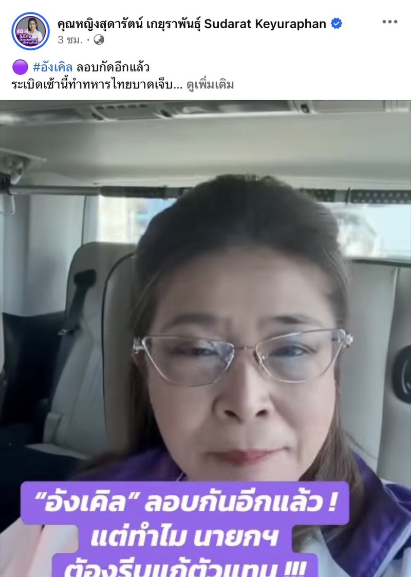 โดย คุณหญิงสุดารัตน์ แสดงความคิดเห็นถึงเหตุการณ์ที่เกิดขึ้นผ่านเพจเฟสบุ๊คส่วนตัว โดยในโพสต์ ได้กล่าวว่า "อังเคิลรอบกัดอีกแล้วนะคะ เช้านี้ยิงระเบิดมาทำให้ทหารไทยบาดเจ็บ แล้วทำไมนายกอนุทินต้องรีบแก้ตัวให้อังเคิลคะ ว่าเป็นอุบัติเหตุ เรื่องนี้เรายอมไม่ได้นะคะ นายกอนุทินรับผิดชอบด้วย เราต้องเอาให้จบ และทำให้กัมพูชาไม่เป็นภัยคุกคามต่อคนไทยและทหารไทยอีกต่อไปค่ะ"