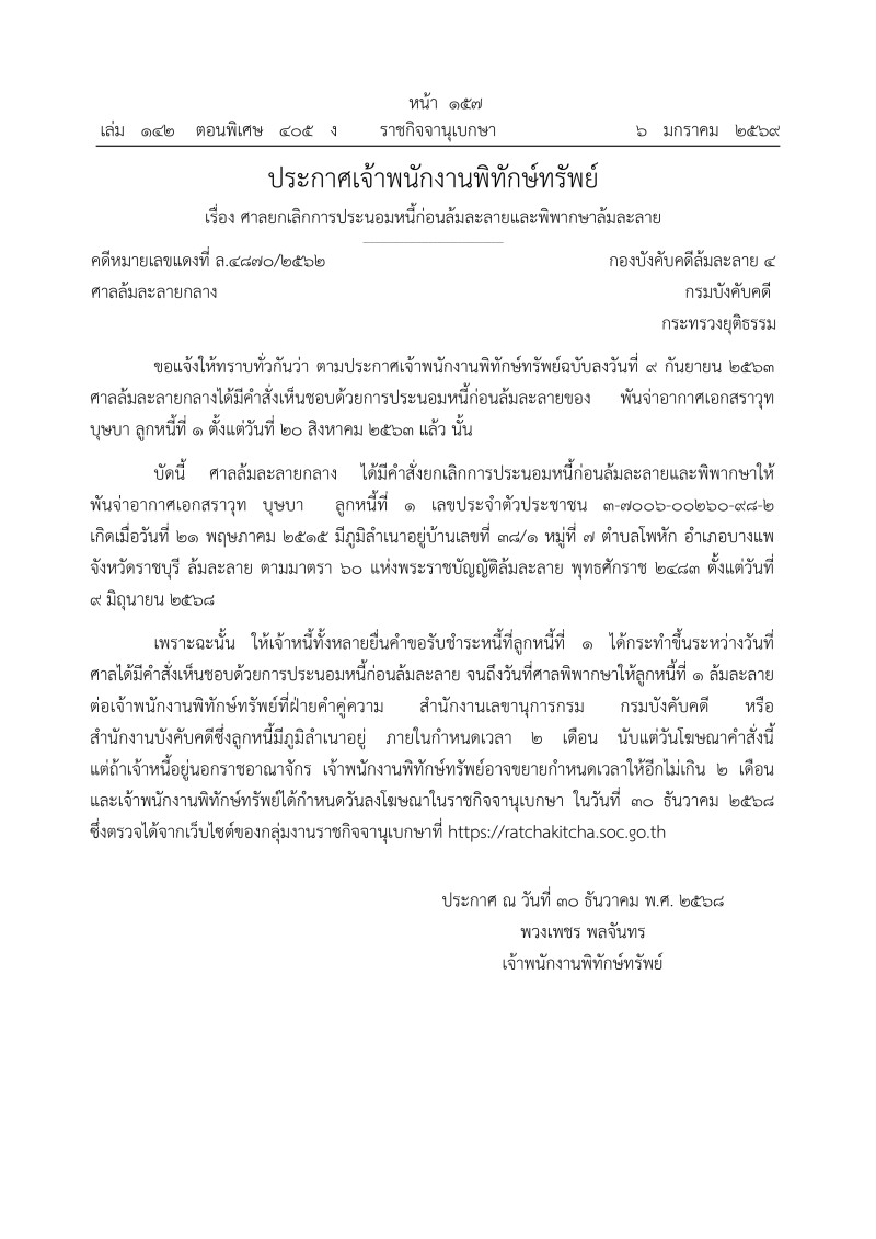 บัดนี้ ศาลล้มละลายกลาง ได้มีคำสั่งยกเลิกการประนอมหนี้ก่อนล้มละลายและพิพากษาให้ พันจ่าอากาศเอกสราวุท บุษบา ลูกหนี้ที่ 1 ล้มละลาย ตามมาตรา 60 แห่งพระราชบัญญัติล้มละลาย พุทธศักราช 2483 ตั้งแต่วันต่วันที่ 9 มิถุนายน 2568