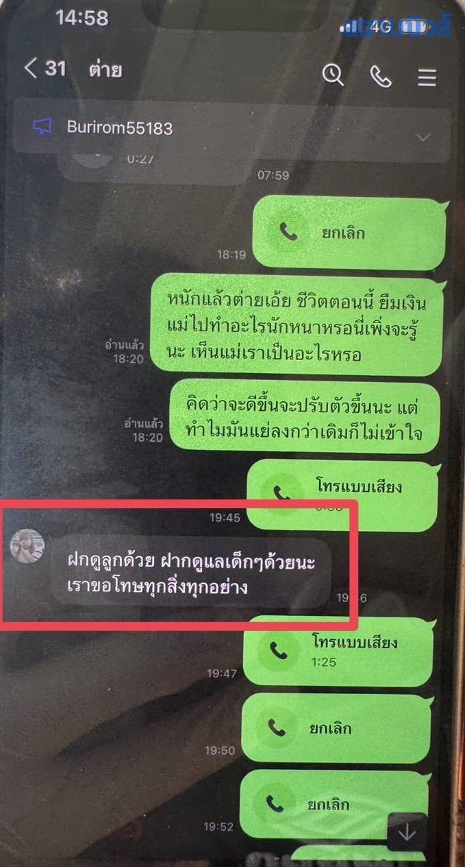 จากการตรวจสอบโทรศัพท์มือถือของผู้เสียชีวิตและโทรศัพท์ของแฟนหนุ่มมีข้อความระบุว่า ”หนักแล้วต่ายเอ้ย ชีวิตตอนนี้ ยืมเงินแม่ไปทำอะไรนักหนาเหรอ นี่เพิ่งจะรู้นะ เห็นแม่เราเป็นอะไรเหรอ“ ขณะที่ข้อความของคนตายตอบกลับว่า “ฝากดูแลลูกๆด้วย เราไม่อยากอยู่แบบความรู้สึกแบบนี้แล้ว“ ข้อความแฟนตอบกลับว่า” ทำอะไรก็สงสารลูกบ้างนะ คนที่ทุกข์ทรมานที่สุดจะคือเราและลูก รีบกลับบ้านไปทำงานเถอะ เราจะอาบน้ำให้ลูกไปร.ร.”