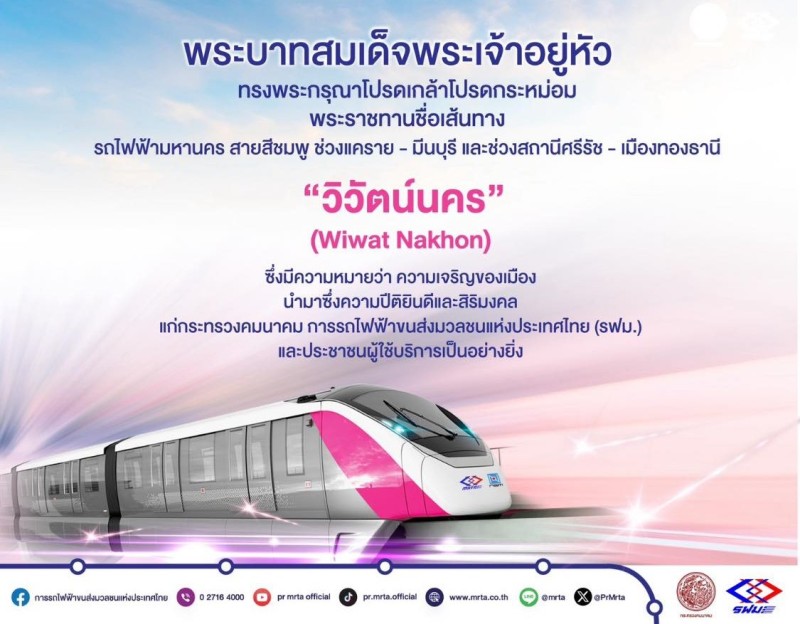 วันที่ 7 มกราคม 2569 พระบาทสมเด็จพระเจ้าอยู่หัว ทรงพระกรุณาโปรดเกล้าโปรดกระหม่อม พระราชทานชื่อเส้นทางรถไฟฟ้ามหานคร สายสีชมพู ณ กรุงเทพมหานคร ให้มีชื่อว่า วิวัฒน์นคร (อ่านว่า วิ-วัด-นะ-คอน) Wiwat Nakhon มีความหมายว่า ความเจริญของเมือง