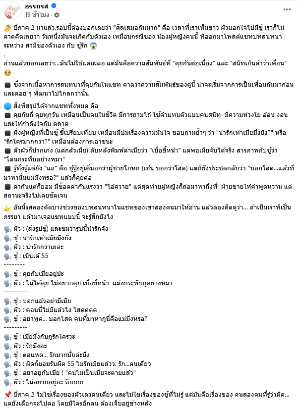 โดยเพจอรรถรส ระบุว่า บี๋ภาค 2 มาแล้ว รอบนี้ต้องบอกเลยว่า ศีลเสมอกันมาก คือ เวลาที่เราเห็นข่าว ผัวนอกใจไปมีชู้ เราก็ไม่คาดคิดเลยว่า วันหนึ่งมันจะเกิดกับตัวเอง เหมือนกรณีของ น้องผู้หญิงคนนี้ ที่ออกมาโพสต์แชทบทสนทนา ระหว่าง สามีของตัวเอง กับ ชู้รัก