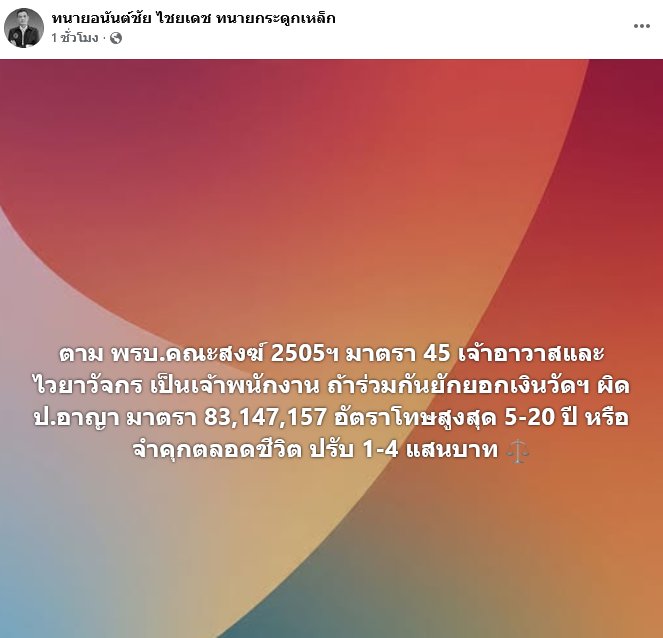 ก่อนจะโพสต์อีกครั้งว่า ตาม พรบ.คณะสงฆ์ 2505ฯ มาตรา 45 เจ้าอาวาสและไวยาวัจกร เป็นเจ้าพนักงาน ถ้าร่วมกันยักยอกเงินวัดฯ ผิด ป.อาญา มาตรา 83,147,157 อัตราโทษสูงสุด 5 - 20 ปี หรือจำคุกตลอดชีวิต ปรับ 1 - 4 แสนบาท