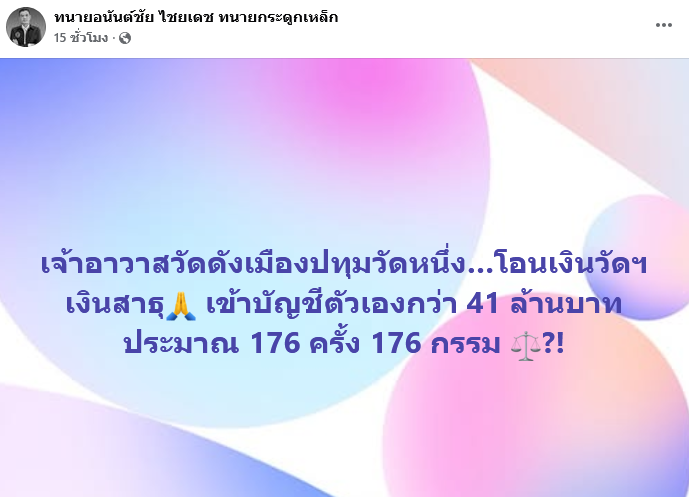 เรียกได้ว่าทำเอาวงการสงฆ์สะเทือนอีกครั้ง เมื่อทนายดังอย่างนายอนันต์ชัย ไชยเดช ได้ออกมาโพสต์ข้ความผ่านเพจเฟซบุ๊ก ทนายอนันต์ชัย ไชยเดช ทนายกระดูกเหล็ก โดยระบุว่า เจ้าอาวาสวัดดังเมืองปทุมวัดหนึ่ง โอนเงินวัดฯ เงินสาธุ เข้าบัญชีตัวเองกว่า 41 ล้านบาท ประมาณ 176 ครั้ง 176 กรรม