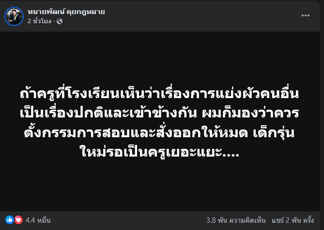 ล่าสุด เพจเฟซบุ๊ก ทนายพัฒน์ คุยกฎหมาย หรือที่หลายคนรู้จักในชื่อ ทนายเมียหลวง ได้โพสต์ข้อความว่า ถ้าครูที่โรงเรียนเห็นว่าเรื่องการแย่งผัวคนอื่นเป็นเรื่องปกติและเข้าข้างกัน ผมก็มองว่าควรตั้งกรรมการสอบและสั่งออกให้หมด เด็กรุ่นใหม่รอเป็นครูเยอะแยะ