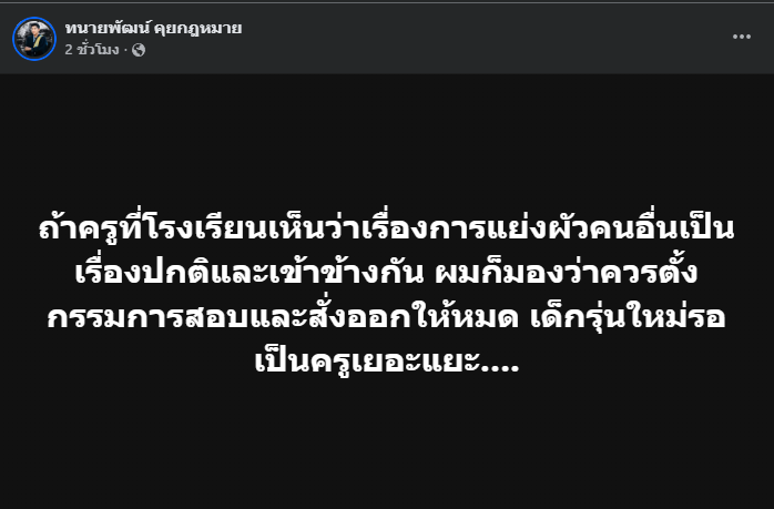 ระบุว่า หากครูในโรงเรียนเห็นว่าเรื่องการแย่งผัวคนอื่นเป็นเรื่องปกติและเข้าข้างกัน เขามองว่าควรตั้งกรรมการสอบและสั่งออกให้หมด