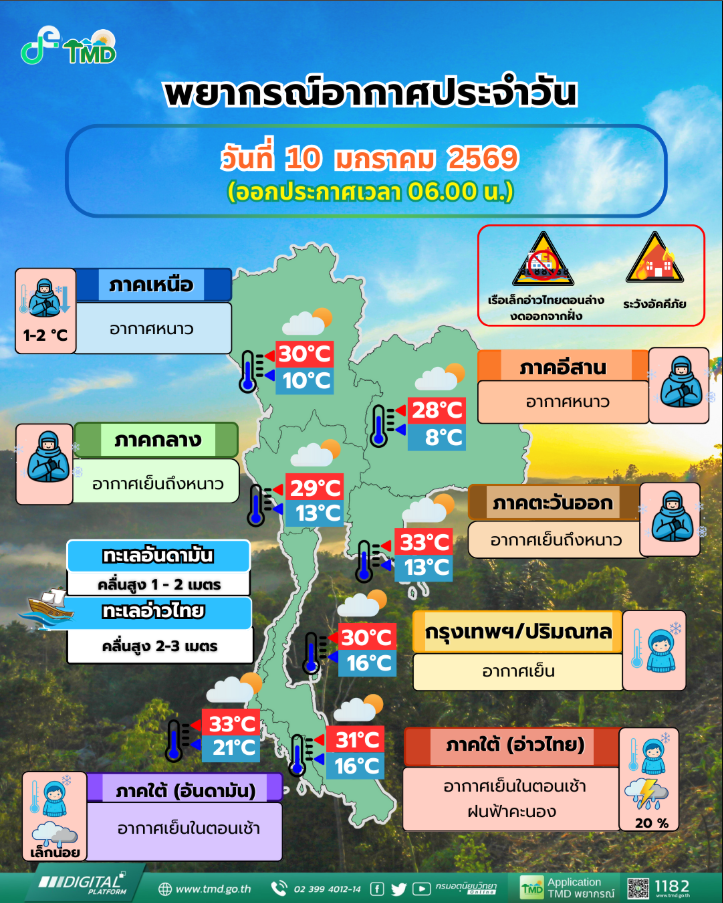 วันที่ 10 ม.ค.2568 กรมอุตุนิยมวิทยา พยากรณ์อากาศ 24 ชั่วโมงข้างหน้า ประเทศไทยตอนบนยังคงมีอากาศหนาวเย็น เนื่องจากบริเวณความกดอากาศสูงหรือมวลอากาศเย็นกำลังแรงจากประเทศจีนปกคลุมประเทศไทยตอนบน ขอให้ประชาชนดูแลรักษาสุขภาพเนื่องจากสภาพอากาศที่หนาวเย็นลง รวมทั้งให้ระวังอันตรายจากอัคคีภัยเนื่องจากสภาพอากาศแห้งและลมแรง