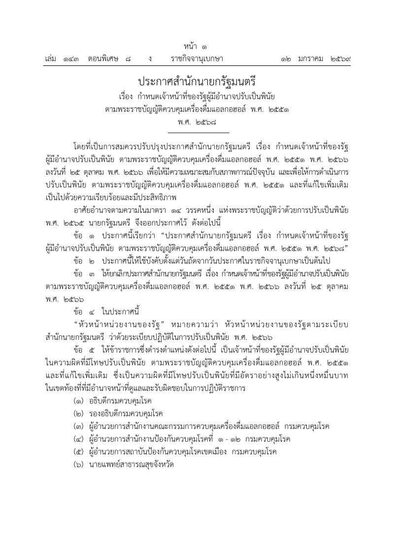 เมื่อวันที่ 13 มกราคม 2569 มีรายงานว่า เว็บไซต์ ราชกิจจานุเบกษา เผยเเพร่ ประกาศสำนักนายกรัฐมนตรี เรื่อง กำหนดเจ้าหน้าที่ของรัฐผู้มีอำนาจปรับเป็นพินัย ตามพระราชบัญญัติควบคุมเครื่องดื่มแอลกอฮอล์ พ.ศ. 2551 พ.ศ. 2568