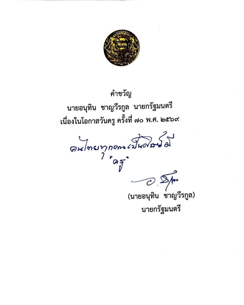 เมื่อวันที่ 13 มกราคม 2569 เพจ คุรุสภา โพสต์ภาพพร้อมข้อความผ่านสื่อสังคมออนไลน์ ระบุสารเนื่องในโอกาสวันครู ครั้งที่ 70 ประจำปี พ.ศ. 2569 โดยเผยแพร่คำขวัญจากนายอนุทิน ชาญวีรกุล นายกรัฐมนตรี