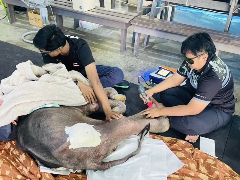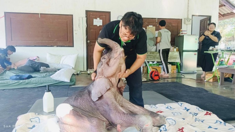 ทีมสัตวแพทย์ดูแลรักษาอย่างเข้มข้น ทั้งการให้สารน้ำทางหลอดเลือดดำทุกวัน การให้วิตามิน ยาบำรุงตับ ยาลดการอักเสบของระบบทางเดินอาหาร แคลเซียมผสมวิตามินรวม รวมถึงการดูแลแผลและแผลกดทับด้วยการทายาและเลเซอร์บำบัด พร้อมนวดและยืดเหยียดขาหน้าอย่างสม่ำเสมอ เจ้าหน้าที่ช่วยพยุงตัวและพลิกตัวทุก 2 ชั่วโมง เพื่อป้องกันแผลกดทับ และเมื่อวันที่ 12 มกราคม ได้มีการเจาะเลือดส่งตรวจทางห้องปฏิบัติการเพิ่มเติม