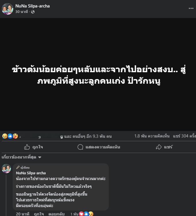 พร้อมระบุเพิ่มเติมว่า น้องจากไปท่ามกลางความรักของผู้คนจำนวนมากค่ะ ร่างกายของน้องในชาตินี้มันไม่ไหวแล้วจริงๆ ขออธิษฐานให้ดวงจิตน้องสู่ภพภูมิที่สูงขึ้น ไปเสวยกายใหม่ที่สมบูรณ์แข็งแรง มีครอบครัวที่อบอุ่นค่ะ