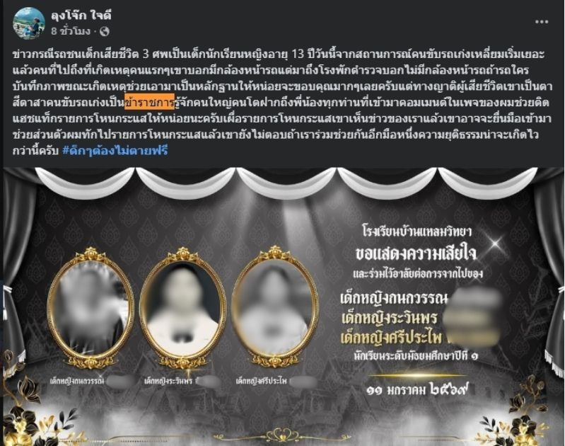 เจ้าของโพสต์จึงขอให้สังคมช่วยกันติดแฮชแท็กรายการโหนกระแส เพื่อให้เรื่องราวได้รับการตรวจสอบอย่างโปร่งใส และช่วยผลักดันให้เกิดความเป็นธรรมกับครอบครัวผู้สูญเสีย โดยทิ้งท้ายข้อความสะเทือนใจว่า เด็ก ๆ ต้องไม่ตายฟรี