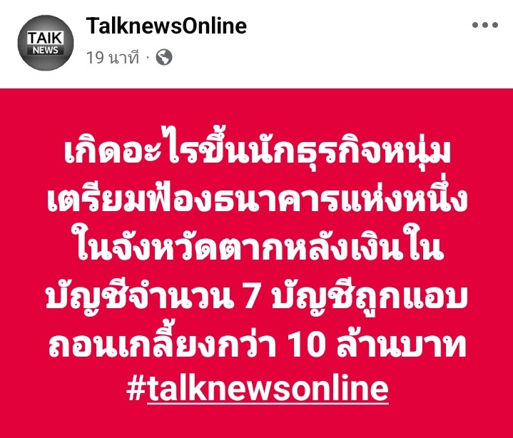 วันที่ 14 มกราคม 2569 ผู้สื่อข่าวรายงานว่า นักธุรกิจหนุ่มรายหนึ่งในจังหวัดตาก เตรียมดำเนินคดีฟ้องร้องธนาคารแห่งหนึ่ง หลังพบว่าเงินในบัญชีธนาคารของตนจำนวน 7 บัญชี ถูกแอบถอนออกไปจนหมด รวมมูลค่าความเสียหายกว่า 10 ล้านบาท