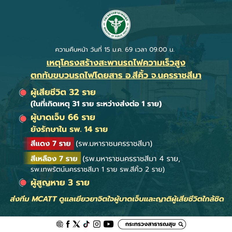 เมื่อเวลา 11.37 น. วันที่ 15 มกราคม 2569 ศูนย์ประชาสัมพันธ์กระทรวงสาธารณสุข (สธ.) ได้ออกมาโพสต์รายงาน ผ่านเพจเฟซบุ๊กทางการ กระทรวงสาธารณสุข โดยระบุว่า ความคืบหน้า วันที่ 15 ม.ค. 69 เวลา 09.00 น. เหตุโครงสร้างสะพานรถไฟความเร็วสูงตกทับขบวนรถไฟโดยสาร อ.สีคิ้ว จ.นครราชสีมา