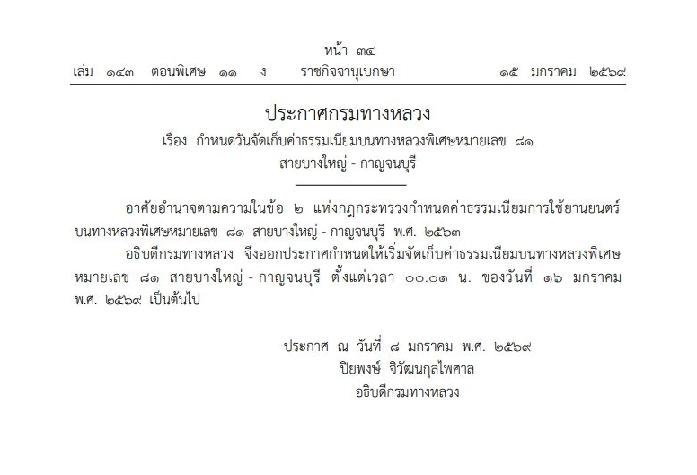 วันที่ 16 ม.ค.2569 ราชกิจจานุเบกษา เผยแพร่ ประกาศกรมทางหลวง เรื่อง กำหนดวันจัดเก็บค่าธรรมเนียมบนทางหลวงพิเศษหมายเลข 81(M-81) สายบางใหญ่-กาญจนบุรี ลงนามโดย นายปิยพงษ์ จิวัฒนกุลไพศาล อธิบดีกรมทางหลวง