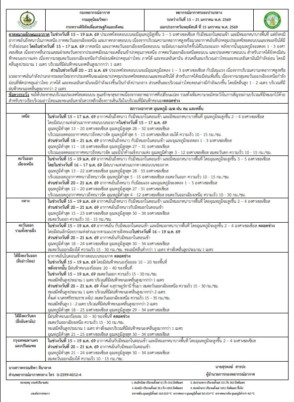 ภาคกลาง ในช่วงวันที่ 15-19 ม.ค. 69 อากาศเย็นถึงหนาว กับมีหมอกในตอนเช้า และมีหมอกหนาบางพื้นที่ โดยอุณหภูมิจะสูงขึ้น 2-4 องศาเซลเซียส ส่วนช่วงวันที่ 20-21 ม.ค. 69 อากาศเย็นถึงหนาวกับมีหมอกในตอนเช้า อุณหภูมิต่ำสุด 15-23 องศาเซลเซียส อุณหภูมิสูงสุด 30-34 องศาเซลเซียส ลมตะวันออก ความเร็ว 10-15 กม./ชม.