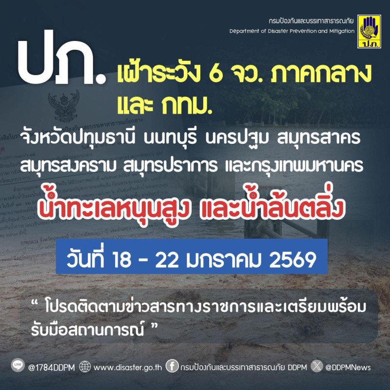 นายธีรพัฒน์ คัชมาตย์ อธิบดีกรมป้องกันและบรรเทาสาธารณภัย เปิดเผยพื้นที่เฝ้าระวังสถานการณ์น้ำทะเลหนุนสูง ระหว่างวันที่ 18 - 22 มกราคม 2569 ดังนี้ภาคกลาง 6 จังหวัด และกรุงเทพมหานคร ได้แก่ จังหวัดปทุมธานี (อำเภอเมืองปทุมธานี และอำเภอสามโคก) จังหวัดนนทบุรี (อำเภอเมืองนนทบุรี อำเภอปากเกร็ด และอำเภอบางกรวย) จังหวัดนครปฐม (อำเภอบางเลน อำเภอนครชัยศรี และอำเภอสามพราน) จังหวัดสมุทรสาคร (ทุกอำเภอ) จังหวัดสมุทรสงคราม (อำเภอเมืองสมุทรสงคราม) และจังหวัดสมุทรปราการ (อำเภอเมืองสมุทรปราการ อำเภอพระสมุทรเจดีย์ อำเภอพระประแดง และอำเภอบางบ่อ)