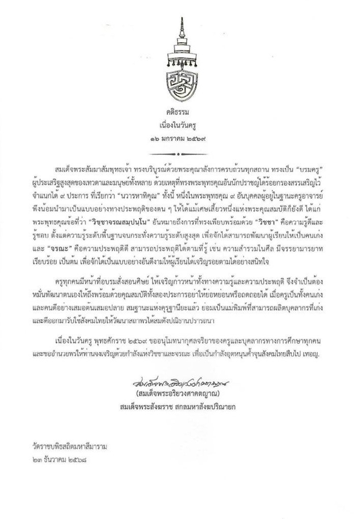 เนื่องในวันครู พุทธศักราช 2569 ขออนุโมทนากุศลจริยาของครูและบุคลากรทางการศึกษาทุกคนและขออำนวยพรให้ท่านจงเจริญด้วยกำลังแห่งวิชชาและจรณะ เพื่อเป็นกำลังอุดหนุนค้ำจุนสังคมไทยสืบสืบไป เทอญ