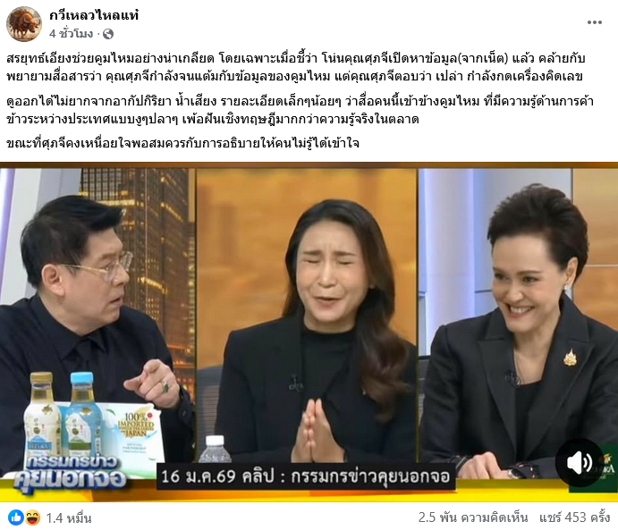 เมื่อวันที่ 16 มกราคม 2569 ในรายการ กรรมกรข่าว คุยนอกจอ ดำเนินรายการโดย สรยุทธ สุทัศนะจินดา พร้อมกับเเขกรับเชิญ ศุภจี สุธรรมพันธุ์ ผู้แทนพรรคภูมิใจไทย และ ศิริกัญญา ตันสกุล ผู้แทนพรรคประชาชน ซึ่งได้มีการพูดคุยแลกเปลี่ยนความเห็นในประเด็นการกำหนดเกณฑ์ขั้นต่ำสต๊อกข้าวสำหรับผู้ส่งออก และผลกระทบต่อผู้ประกอบการรายย่อย ทั้งนี้ ในรายการดังกล่าวเสียงจากโซเชียลมองว่าคุณสรยุทธ สุทัศนะจินดา ได้มีการพูดคุย และถกกันที่ค่อนข้างจะเอนเอียงไปฝั่งคุณไหมหรือไม่นั้น