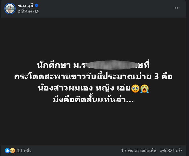 วันที่ 17 มกราคม 2569 มีรายงานว่า เฟซบุ๊ก ซอง ดูฮี อินฟลูชื่อดัง ได้โพสต์ข่าวช็อกระบุว่า นักศึกษา ม.ดังที่กระโดดสะพานขาววันนี้ประมาณบ่าย 3 คือน้องสาวผมเอง หญิง เอ่ย มึงคือคิดสั้นเเท้หล่า