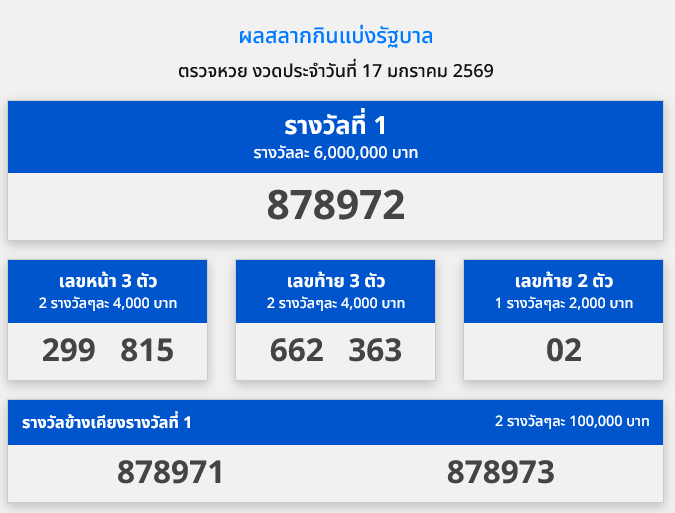 ภายหลังสำนักงานสลากกินแบ่งรัฐบาล ประกาศผลการออกรางวัล งวดวันที่ 17 มกราคม 2569 ประกอบไปด้วยรางวัลสำคัญ ดังนี้
