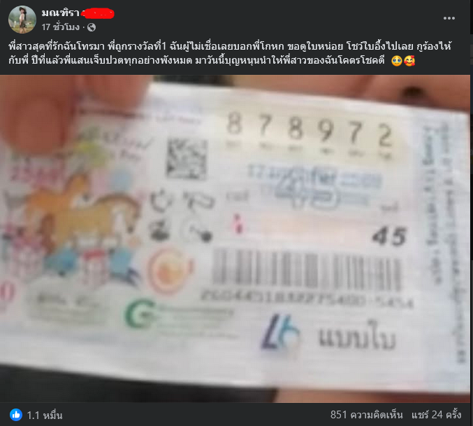 ล่าสุดหลังจากประกาศผลการออกรางวัลดังกล่าว ผู้ใช้เฟซบุ๊กรายหนึ่งชื่อ มณฑิรา (สงวนนามสกุล) ได้โพสต์ข้อความระบุว่า พี่สาวสุดที่รักฉันโทรมา พี่ถูกรางวัลที่1 ฉันผู้ไม่เชื่อเลยบอกพี่โกหก ขอดูใบหน่อย โชว์ใบอึ้งไปเลย กูร้องไห้กับพี่ ปีที่แล้วพี่แสนเจ็บปวดทุกอย่างพังหมด มาวันนี้บุญหนุนนำให้พี่สาวของฉันโคตรโชคดี