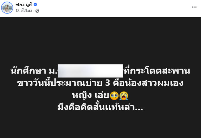 จากกรณีมีรายงานข่าวเศร้าเกี่ยวกับการจากไปของน้องสาว ซอง ดูฮี อินฟลูเอนเซอร์ชื่อดัง เมื่อทางด้านพี่ชายอย่าง ซอง ดูฮี ได้ออกมาโพสต์ข้ความผ่านเพจเฟซบุ๊ก ซอง ดูฮี เมื่อวานที่ผ่านมา (17 ม.ค. 69) โดยระบุว่า นักศึกษา ม.ดัง ที่กระโดดสะพานขาววันนี้ประมาณบ่าย 3 คือน้องสาวผมเอง หญิง เอ่ย มึxคือคิดสั้นเเท้หล่า