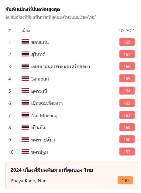 ส่วน 10 อันดับ เมื่องในประเทศไทยที่มีมลพิษทางอากาศมากที่สุด คือ