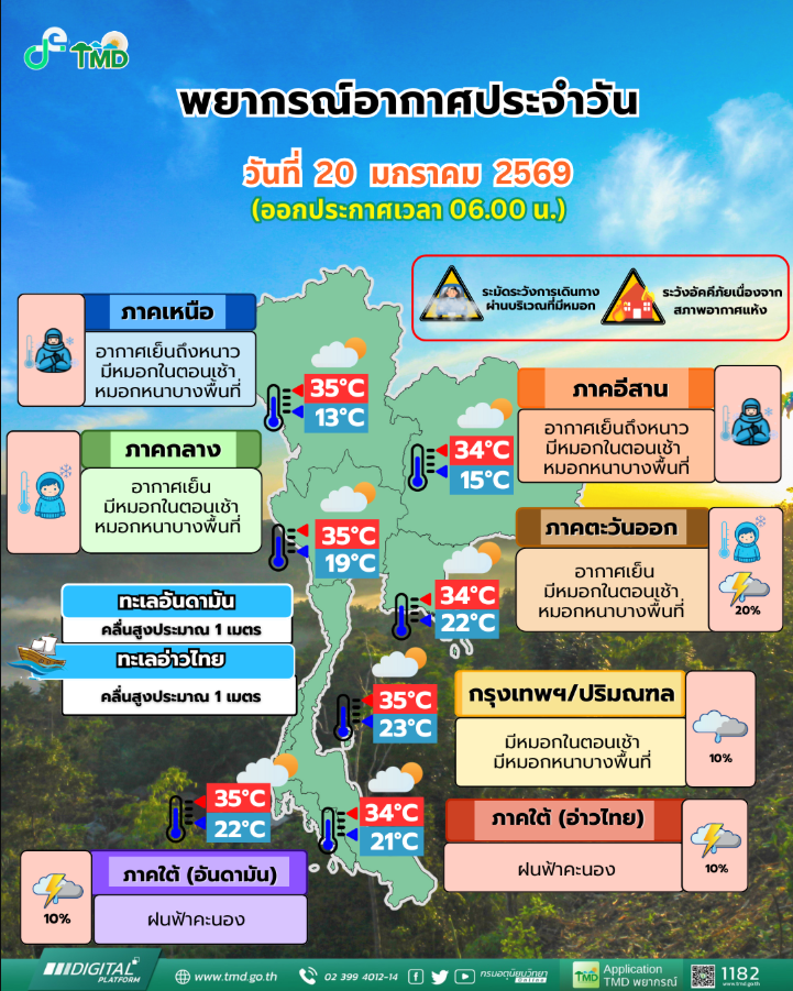 วันที่ 20 ม.ค.2568 กรมอุตุนิยมวิทยา พยากรณ์อากาศ 24 ชั่วโมงข้างหน้า ประเทศไทยตอนบนมีอากาศเย็นกับมีหมอกในตอนเช้าและมีหมอกหนาบางพื้นที่ โดยภาคเหนือและภาคตะวันออกเฉียงเหนือ ตอนบนยังคงมีอากาศเย็นถึงหนาว เนื่องจากบริเวณความกดอากาศสูงหรือมวลอากาศเย็นกำลังอ่อนปกคลุมประเทศไทยตอนบน ในขณะที่ลมฝ่ายตะวันตกจากประเทศเมียนมาเคลื่อนเข้าปกคลุมภาคเหนือตอนบนและลาวตอนบน