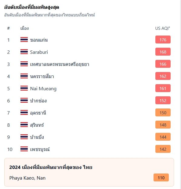 นอกจากนี้ทางเว็บ รายงานอันดับเมืองที่มีมลพิษมากที่สุดของไทยแบบเรียลไทม์ 10 อันดับ โดยพบว่า ขอนแก่น เช้านี้มลพิษในอากาศสูงสุดในประเทศ