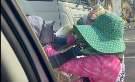 ล่าสุด บริเวณแยกปราสาท จ. สุรินทร์ พบว่ามีพ่อค้าแม่ค้าขายของอยู่หลายคน เดินขายช่วงที่รถติดไฟแดงของแต่ละแยก ผู้สื่อข่าวมองไปได้เห็นบุคคลคล้ายที่ปรากฏในคลิป กำลังเดินถือโดนัทเข้าไปขายให้กับรถที่จอดติดไฟแดงอยู่ แต่ไม่เห็นคู่กรณีอีกคนที่ขายข้าวเกรียบว่าว
