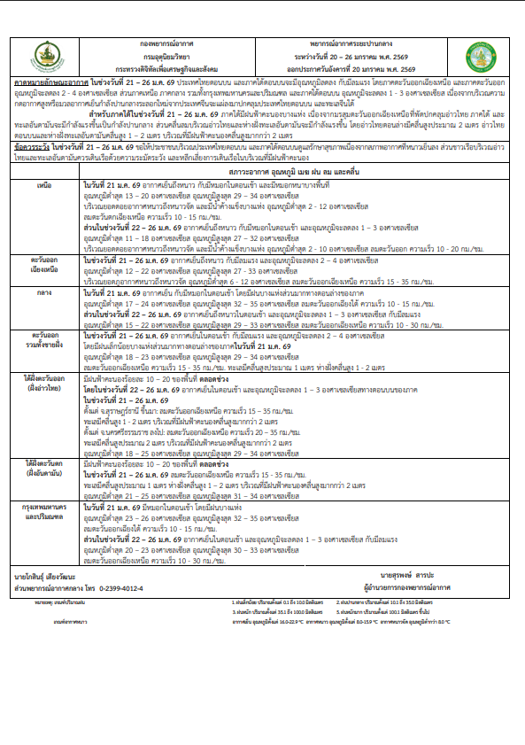 ในช่วงวันที่ 21 – 26 ม.ค. 69 อากาศเย็นในตอนเช้า กับมีลมแรง และอุณหภูมิจะลดลง 2 – 4 องศาเซลเซียส