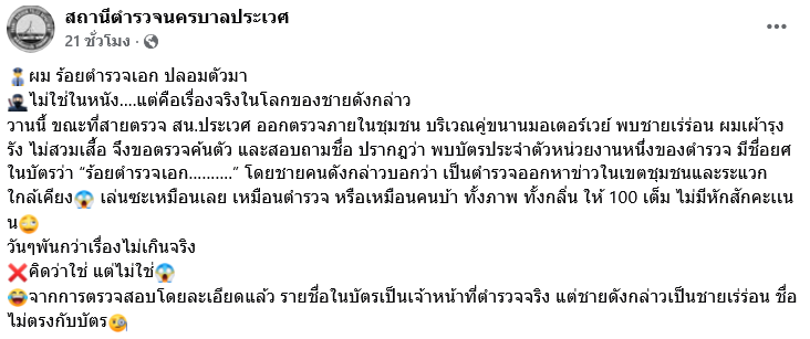 ขณะที่เพจเฟซบุ๊กดังกล่าวโพสต์ข้อความระบุว่า ผม ร้อยตำรวจเอก ปลอมตัวมา ไม่ใช่ในหนัง แต่คือเรื่องจริงในโลกของชายดังกล่าว วานนี้ ขณะที่สายตรวจ สน.ประเวศ ออกตรวจภายในชุมชน บริเวณคู่ขนานมอเตอร์เวย์ พบชายเร่ร่อน ผมเผ้ารุงรัง ไม่สวมเสื้อ จึงขอตรวจค้นตัว และสอบถามชื่อ ปรากฎว่า พบบัตรประจำตัวหน่วยงานหนึ่งของตำรวจ มีชื่อยศในบัตรว่า ร้อยตำรวจเอก