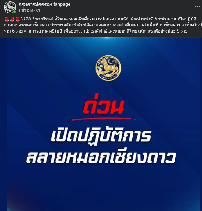 วันที่ 22 มกราคม เพจ กรมการปกครอง fanpage โพตส์แจ้งข้อความระบุว่า นายวิฑูรย์ สิรินุกุล รองอธิบดีกรมการปกครอง สนธิกำลังเจ้าหน้าที่ 5 หน่วยงาน เปิดปฏิบัติการสลายหมอกเชียงดาว นำหมายจับเข้าจับปลัดอำเภอและเจ้าหน้าที่เทศบาลในพื้นที่ อ.เชียงดาว จ.เชียงใหม่ รวม 6 ราย จากการสวมสิทธิใบถิ่นที่อยู่ถาวรกลุ่มชาติพันธุ์และสัญชาติไทยให้ต่างชาติอย่างน้อย 9 ราย