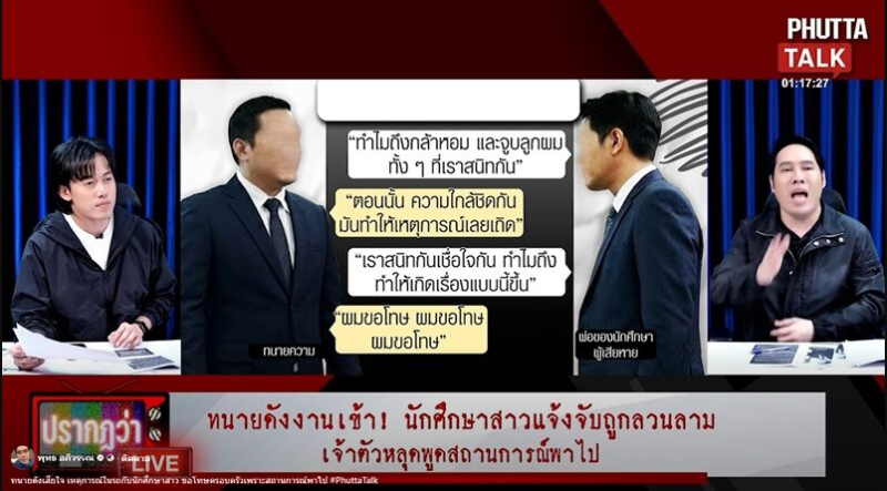 จากกรณีประเด็นร้อน นักศึกษาสาว แจ้งจับ ทนายดัง ลวนลาม แต่ ทนายดังอ้างแค่กอดหอมโต้เรื่องล้วงจกจำไม่ได้ โดย รายการทางช่อง Phutta Talk ของ พุทธ อภิวรรณ ให้ข้อมูลระหว่างที่ทั้งสองฝ่ายเตรียมออกมาชี้แจงวันนี้ (22 ม.ค.69) โดยมีข้อมูลทาง พ่อของนักศึกษาสาว ถามฝั่งทนายว่า ทำไมถึงกล้าหอมและจูบลูก ทั้งที่เราสนิทกัน ด้านทนายก็บอกว่าตอนนั้นความใกล้ชิดกัน ทำให้เหตุการณ์เลยเถิด พร้อมทั้งขอโทษ ขอไม่อยากให้เรื่องขยายวงกว้าง