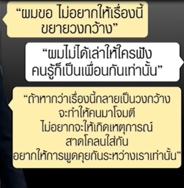 ทางฝั่งพ่อนักศึกษาก็ยืนยันว่าไม่ได้เล่าให้ใครฟัง คนรู้เป็นเพื่อนกันเท่านั้น โดยฝั่งทนายยังบอกว่า หากเรื่องนี้ขยายวงกว้าง จะทำให้ถูกโจมตี สาดโคลนใส่กัน อยากให้พูดคุยระหว่างเราเท่านั้น