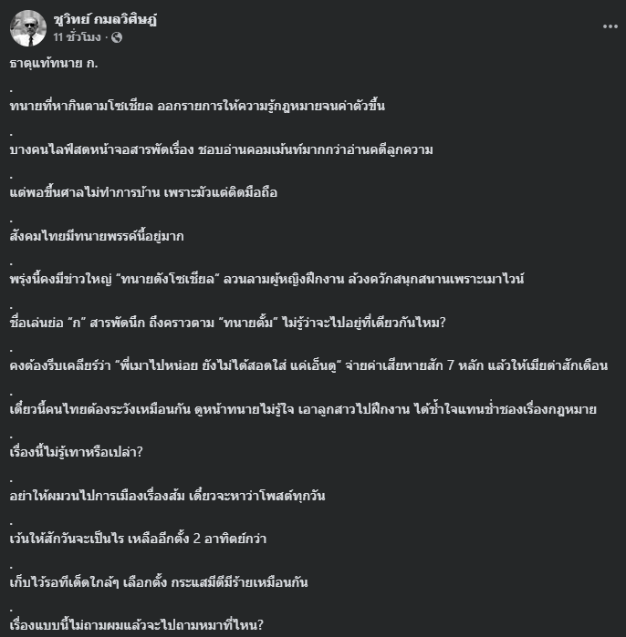 ล่าสุด วันที่ 22 มกราคม 2569 ชูวิทย์ กมลวิศิษฎ์ ซึ่งได้ออกมาแสดงความคิดเห็นผ่านเฟซบุ๊กส่วนตัว โดยมีเนื้อหาวิพากษ์พฤติกรรมของทนายความในแวดวงสังคมออนไลน์ พร้อมตั้งข้อสังเกตถึงกรณีทนายดังโซเชียล ตัวย่อ ก. และระบุข้อความว่า