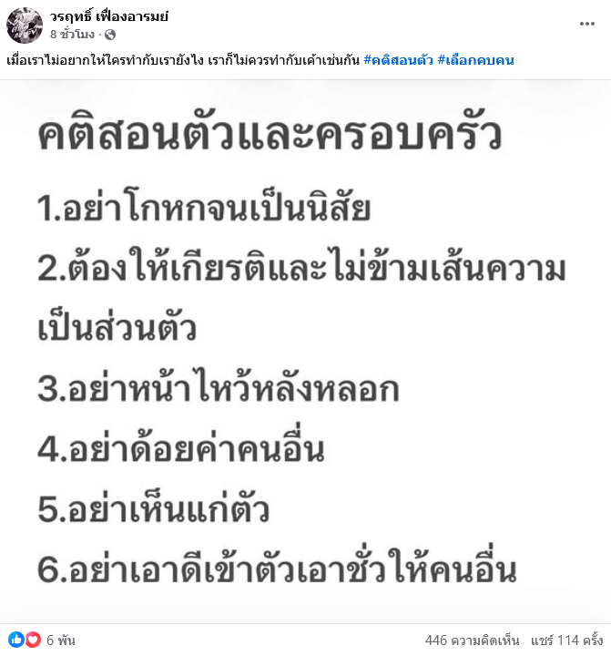พร้อมกับระบุอีกว่า คติสอนตัวและครอบครัว