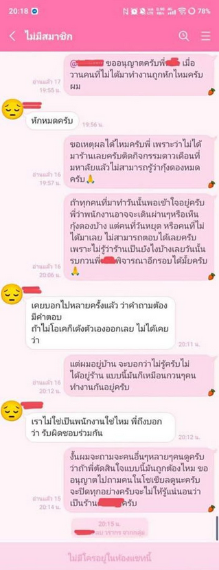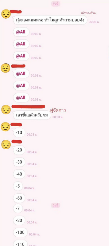 เมื่อพนักงานหลายคนเริ่มตั้งคำถามถึงความไม่เป็นธรรม เจ้าของร้านได้ตอบกลับในลักษณะยืนยันจุดยืนว่า ทุกคำถามต้องมีคำตอบ และทุกคนต้องรับผิดชอบร่วมกัน พร้อมระบุว่า หากไม่พอใจสามารถลาออกได้ ก่อนจะลบพนักงานที่ออกมาโต้แย้งออกจากกลุ่มไลน์ร้านในทันที