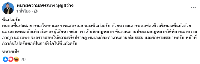 ล่าสุด ด้านทนายเป้ง ซึ่งเป็นทนายความของครอบครัวน้องผู้หญิงวัย 18 ปี ได้ตัดสินใจออกมาโพสต์ข้อความถึง ทนายเเก้ว ผ่านเฟซบุ๊กส่วนตัว ทนายความอรรณพ บุญสว่าง โดยระบุว่า พี่แก้วครับ ผมขอชื่นชมต่อการขอโทษ และการแสดงออกของพี่แก้วครับ ด้วยความเคารพต่อข้อเท็จจริงของพี่แก้วด้วย และเคารพต่อข้อเท็จจริงของผู้เสียหายด้วย