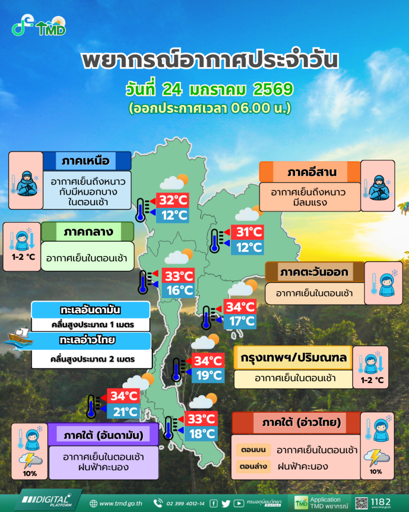 วันที่ 24 ม.ค.2568 กรมอุตุนิยมวิทยา พยากรณ์อากาศ 24 ชั่วโมงข้างหน้า ประเทศไทยตอนบนมีอากาศเย็นถึงหนาว โดยภาคกลางรวมทั้งกรุงเทพมหานครและปริมณฑลจะมีอุณหภูมิลดลงอีก 1-2 องศาเซลเซียส เนื่องจากบริเวณความกดอากาศสูงหรือมวลอากาศเย็นกำลังค่อนข้างแรงจากประเทศจีนได้แผ่ปกคลุมประเทศไทยตอนบน ขอให้ประชาชนดูแลรักษาสุขภาพเนื่องจากสภาพอากาศที่เปลี่ยนแปลงและอากาศที่หนาวเย็นลงไว้ด้วย