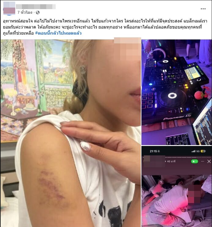 โดยระบุข้อความว่า อุทาหรณ์สอนใจ ต่อไปไม่ไปงานไพรเวทอีกแล้ว ไม่รับแก้วจากใคร ใครส่งอะไรให้ที่แท้มีจุดประสงค์ แบล็กเมลเรา ยอมรับค่ะว่าพลาด ให้อภัยนะคะ จะขู่อะไรจะทำอะไร ยอมทุกอย่าง หนีออกมาได้แล้วปลอดภัยขอบคุณทุกคนที่ภูเก็ตที่ช่วยเหลือ #ตอนนี้กลัวไปหมดแล้ว