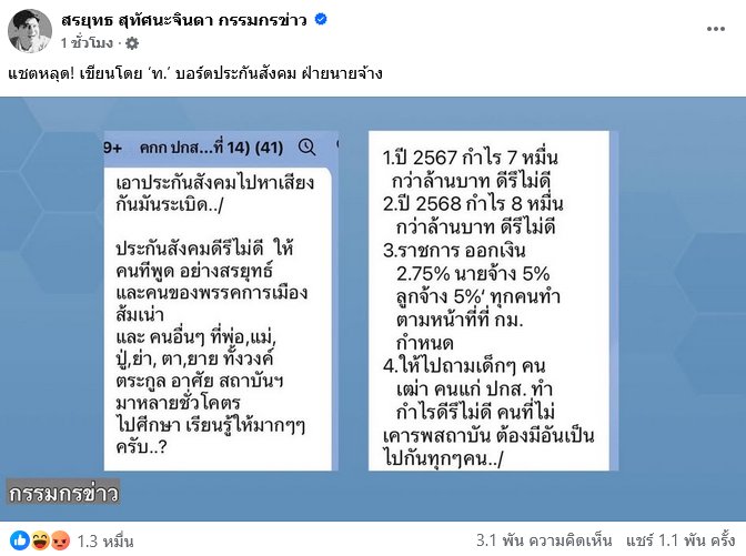 ก่อนที่จะโพสต์อีกครั้งในเวลาต่อมา โดยโพสต์ดังกล่าวได้ระบุว่า แชตหลุด เขียนโดย ท. บอร์ดประกันสังคม ฝ่ายนายจ้าง