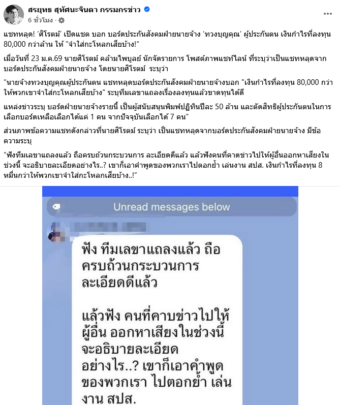 เมื่อวันที่ 23 ม.ค.69 นายศิโรตม์ คล้ามไพบูลย์ นักจัดรายการ โพสต์ภาพแชตไลน์ ที่ระบุว่าเป็นแชตหลุดจากบอร์ดประกันสังคมฝ่ายนายจ้าง โดยนายศิโรตม์ ระบุว่า นายจ้างทวงบุญคุณผู้ประกันตน แชตหลุดบอร์ดประกันสังคมฝ่ายนายจ้างบอก เงินกำไรที่ลงทุน 80,000 กว่า ให้พวกเขาจำใส่กะโหลกเสียบ้าง ระบุทีมเลขาแถลงเรื่องลงทุนแล้วขาดทุนได้ดี