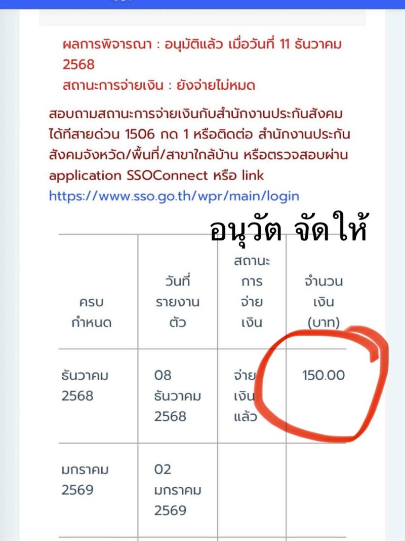 ประกันสังคม รายนี้ที่ได้รับ 150 บาท เนื่องจากวันที่ขึ้นทะเบียนว่างงานเป็นวันแรก ที่มีสิทธิได้รับว่างงานจึงได้รับเงิน 1 วันค่ะ แต่พอเดือนมกราคมที่ไปรายงานวันที่ 2 มกราคม 69 ได้รับสิทธิมกรา 69 ไปรายงานตัววันที่ 2 มกรา จะได้รับเงิน 25 วันค่ะ จำนวนเงิน 3,750 บาท
